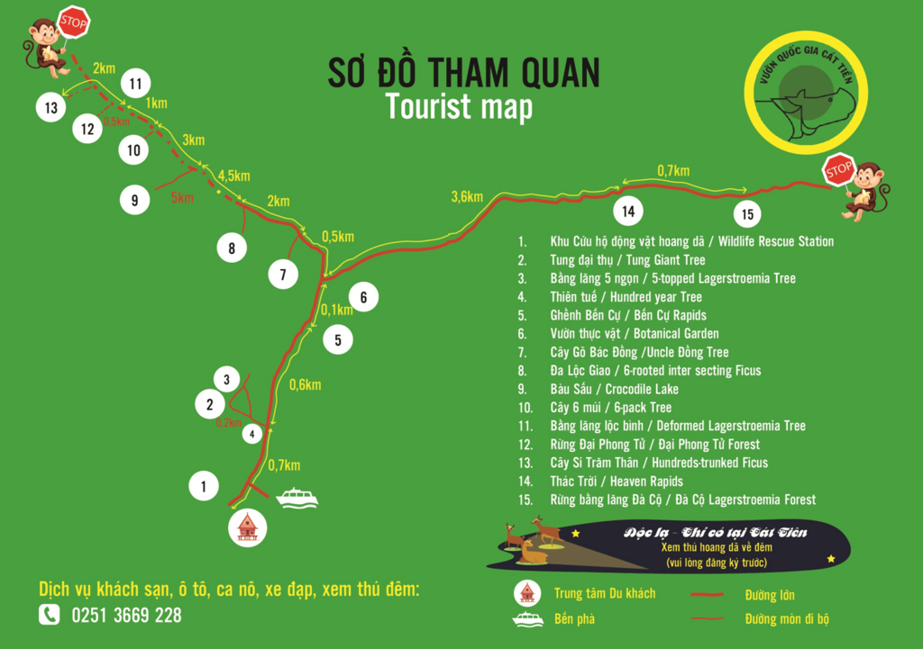 The natural area of Cat Tien National Park is 71,000 ha, and surrounded by 90 km of Dong Nai river. Cat Tien park has 1.730 species of animals and 1.655 species of plants (according to park’s report).
